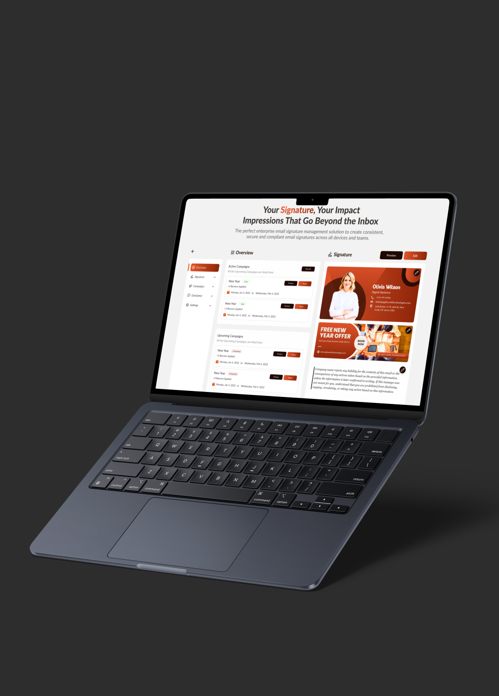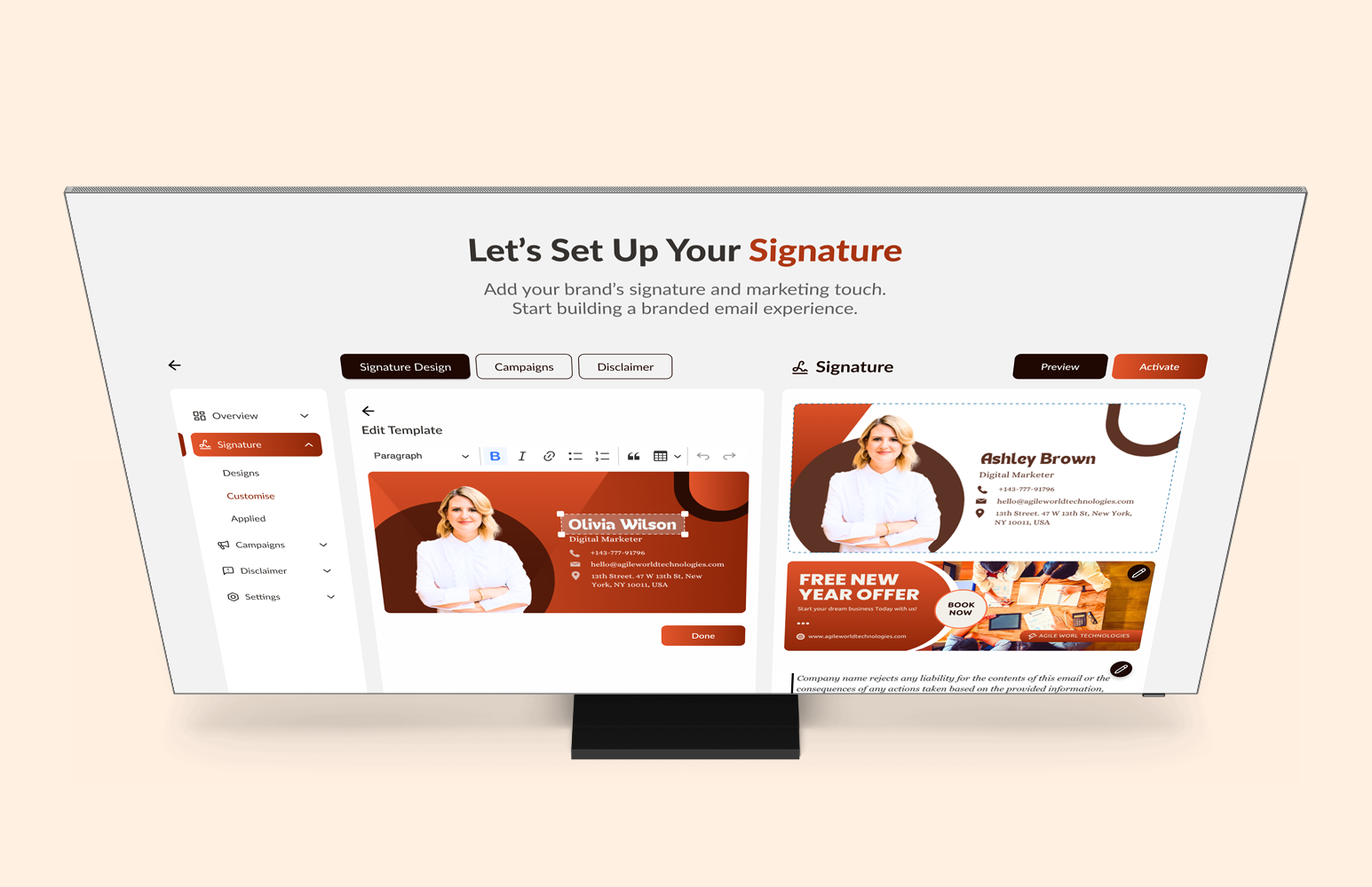The final product allows admins to manage branding elements across the organization in minutes. Email signatures, banners, and disclaimers can be added, edited, scheduled, and applied without manual effort—ensuring consistency and control at scale.